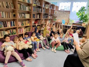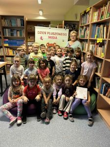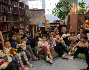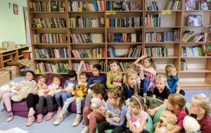 W tym dniu do biblioteki zawitała m.in. grupa VI przedszkolaków ze swoimi ulubionymi misiami. Przybyły misie małe, duże, białe, brązowe a każdy był piękny i wyjątkowy. W trakcie spotkania dzieci otrzymały emblematy z misiami, poznały bohaterów bajek- Misia Uszatka, Kubusia Puchatka, Coralgola oraz robiły sobie zdjęcia w fotobudce. Nie brakowało wierszy, piosenek o tematyce misiowej.