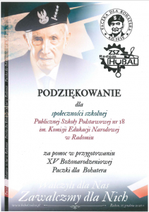 Jak co roku nasza społeczność szkolna włączyła się w ogólnopolską akcję „Paczka dla Bohatera”. Celem zbiórki jest  pomoc Kombatantom i Bohaterom walczącym o wolność naszej Ojczyzny. Zebrana żywność została przekazana do ZSZ  im. mjr H. Dobrzańskiego „Hubala”.  Przy pakowaniu darów pomagali wolontariusze z klas 7b ora 8b.