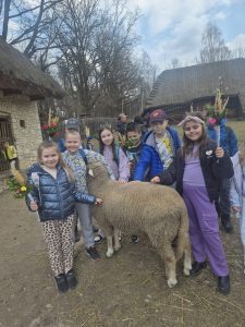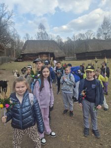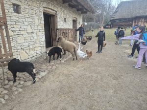 Nie zabrakło również zwiedzania – uczniowie wraz z przewodnikiem poznawali zabytkowe chałupy i ich wnętrza, odkrywając, jak wyglądała codzienność naszych przodków. Ogromną radość sprawiło dzieciom także spotkanie ze zwierzętami, które mogły pogłaskać i zobaczyć z bliska.